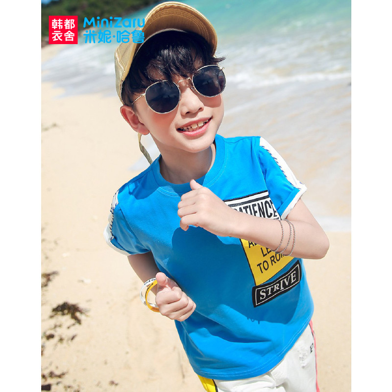 韩都衣舍MiniZaru 米妮哈鲁2018夏季新款男童儿童童装印花短袖百搭舒适套头T恤 蓝色 160