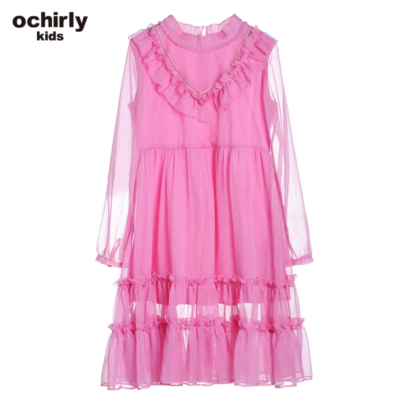 【亲】ochirly kids欧时力童装女童拼荷叶褶皱雪纺连衣裙5G01087350 粉红180 1