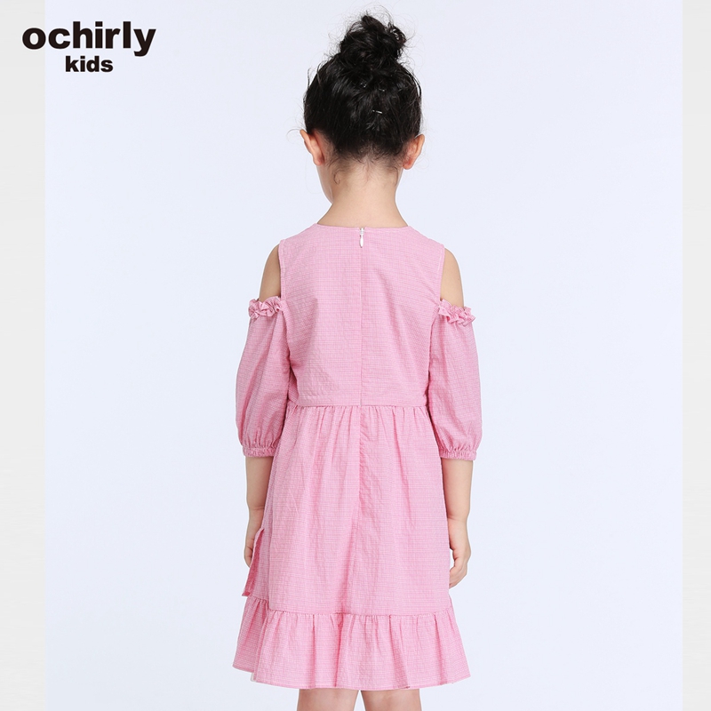 【亲】ochirly kids欧时力童装女童V领荷叶褶露肩连衣裙5G01087630 红杏格964