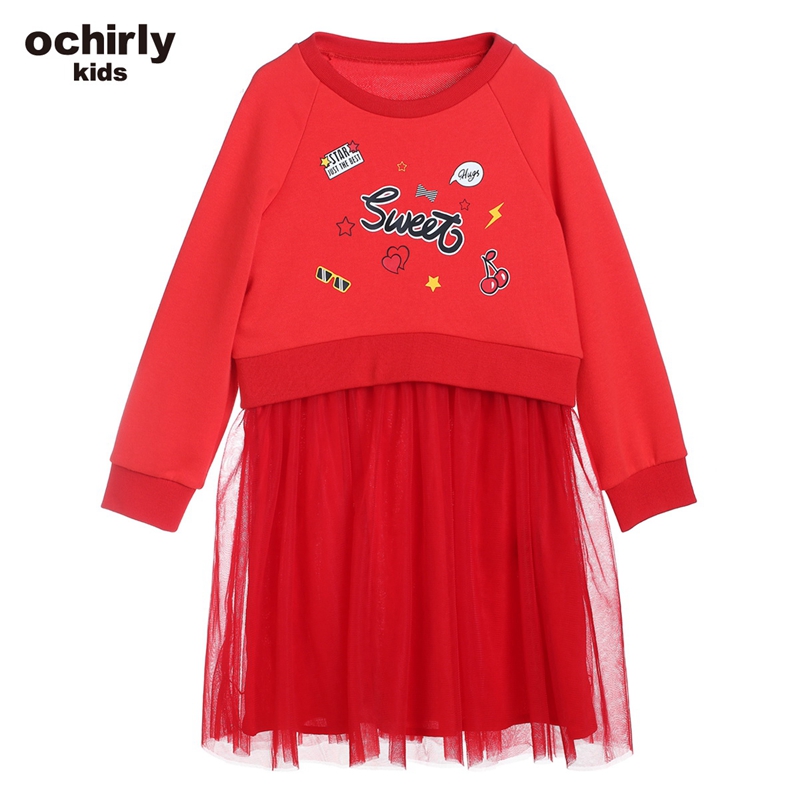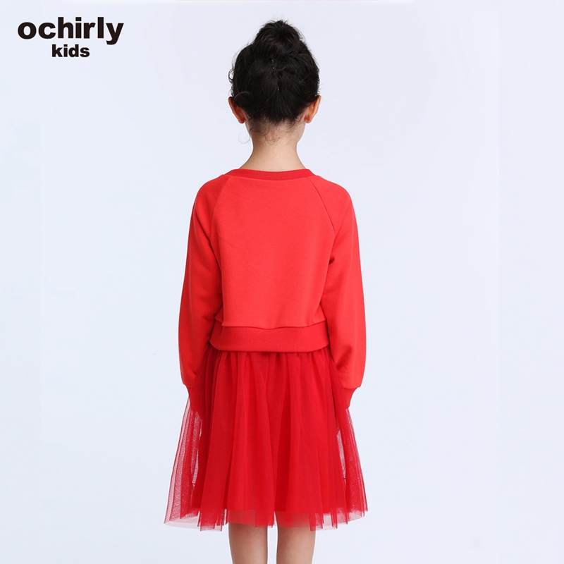 【亲】ochirly kids欧时力童装女童卫衣拼网纱长袖连衣裙5G01088090 大红120 1