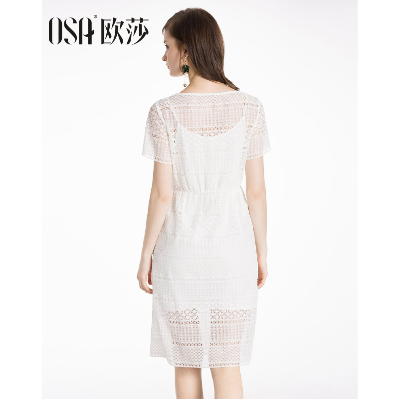 欧莎OSA 2018夏装 名媛修身显瘦收腰镂空蕾丝连衣裙内搭两件套中长连衣裙 白色 L