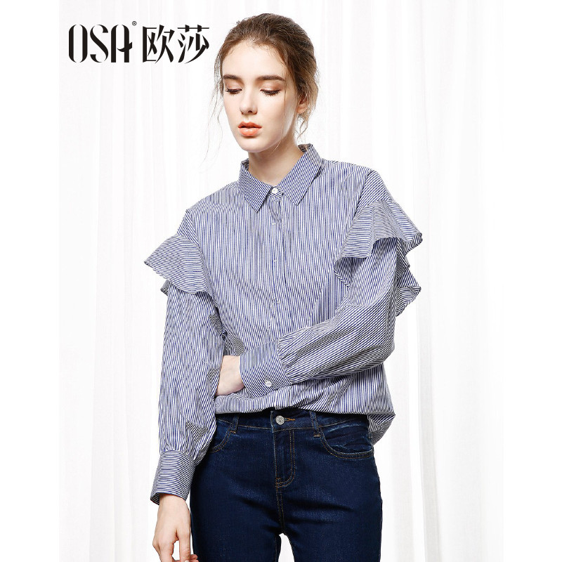 欧莎OSA 秋冬款 蓝白条纹条纹复古简约花边衬衫长袖衬衫女 蓝白条纹 M